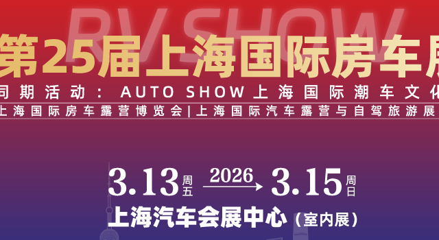 2026第25届上海国际房车展(The 25rd Shanghai International RV Show)将于 3月13日-15日在上海汽车会展中心(嘉定区博园路7575号)举办